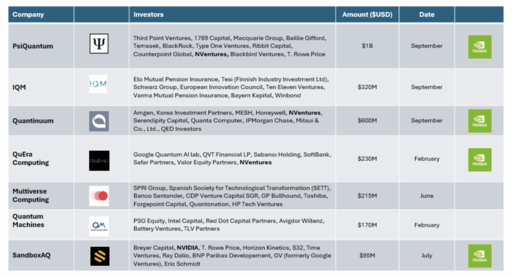 - NVIDIA’s venture arm NVentures invested in QuEra, Quantinuum and PsiQuantum in early 2025, signaling a strategic shift toward quantum computing after years of skepticism.