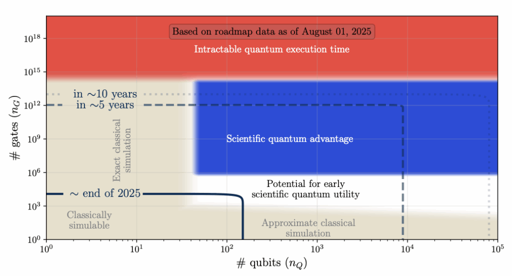 At the same time, public roadmaps from ten quantum computing companies — spanning superconducting circuits, trapped ions, and neutral atoms — predict machines capable of scaling by as much as nine orders of magnitude within ten years. When overlaid against algorithmic requirements, the projections suggest that large-scale quantum systems could align with scientific needs within five to ten years.