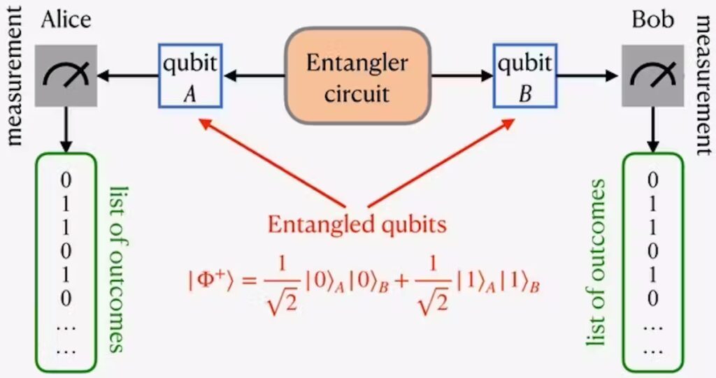 Let’s imagine two quantum engineers, who we named Alice and Bob in our illustration. Each takes one qubit from the pair and travels somewhere far apart. When they measure their qubits, they’ll both obtain a 0 or a 1 with equal probability.