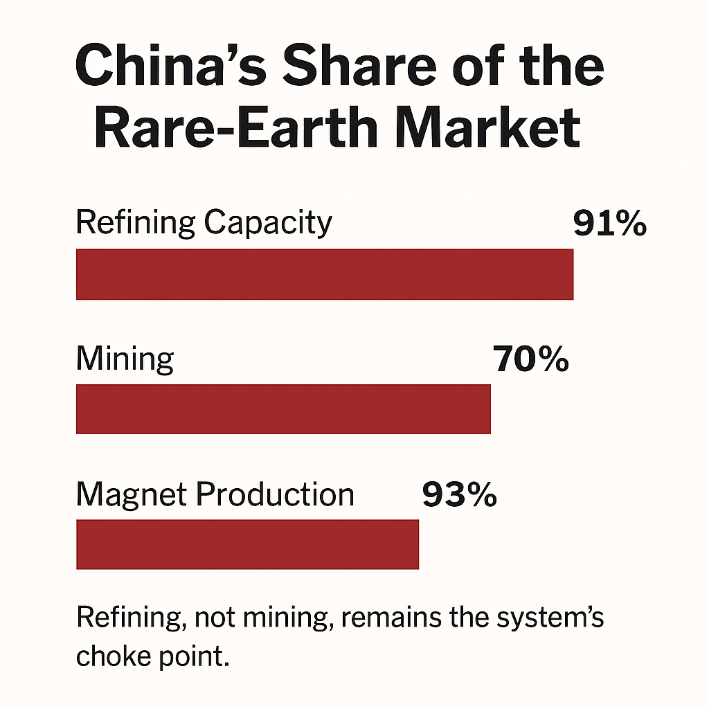 • China dominates the global rare-earth supply chain, controlling about 90 percent of refining capacity and the majority of downstream magnet manufacturing.