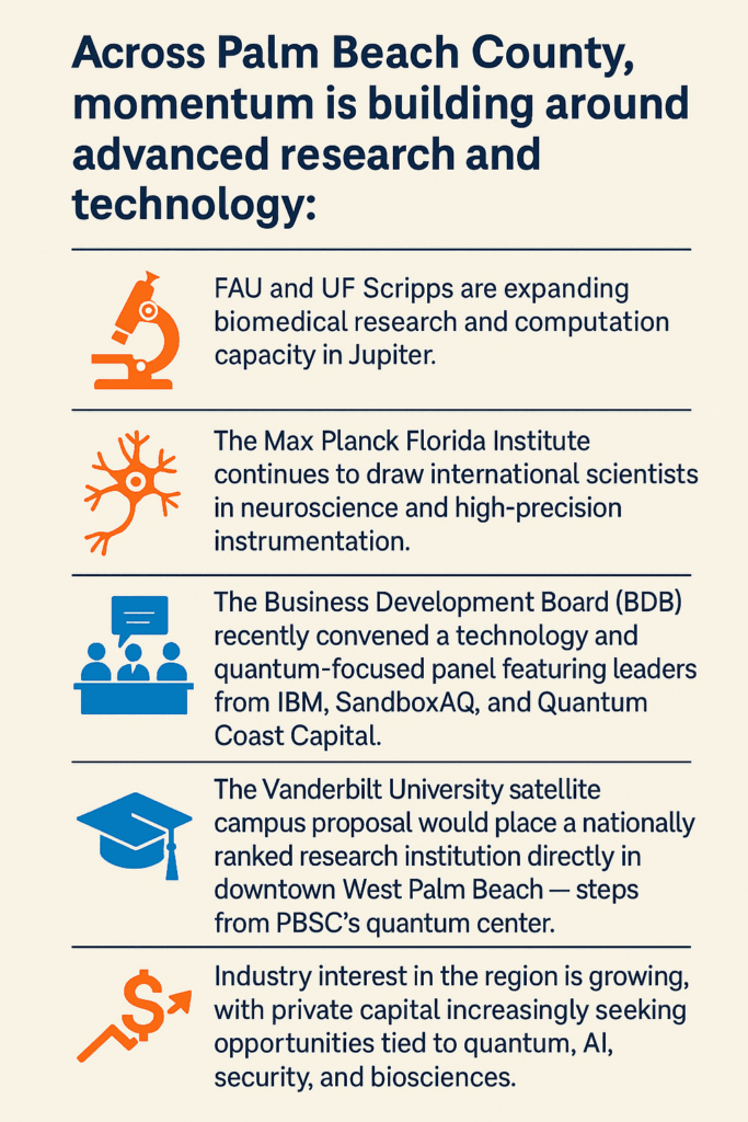 The campus holds a uniquely strategic position. It is directly connected to Florida LambdaRail, the high-speed research network used by major universities across the state. Just steps away is Dreyfoos School of the Arts, where students have already formed a quantum club — a rare early signal of grassroots interest. And across the street sits the proposed site of Vanderbilt University’s satellite Florida campus, positioning PBSC at the center of an emerging educational corridor that could soon integrate quantum studies across multiple institutions.